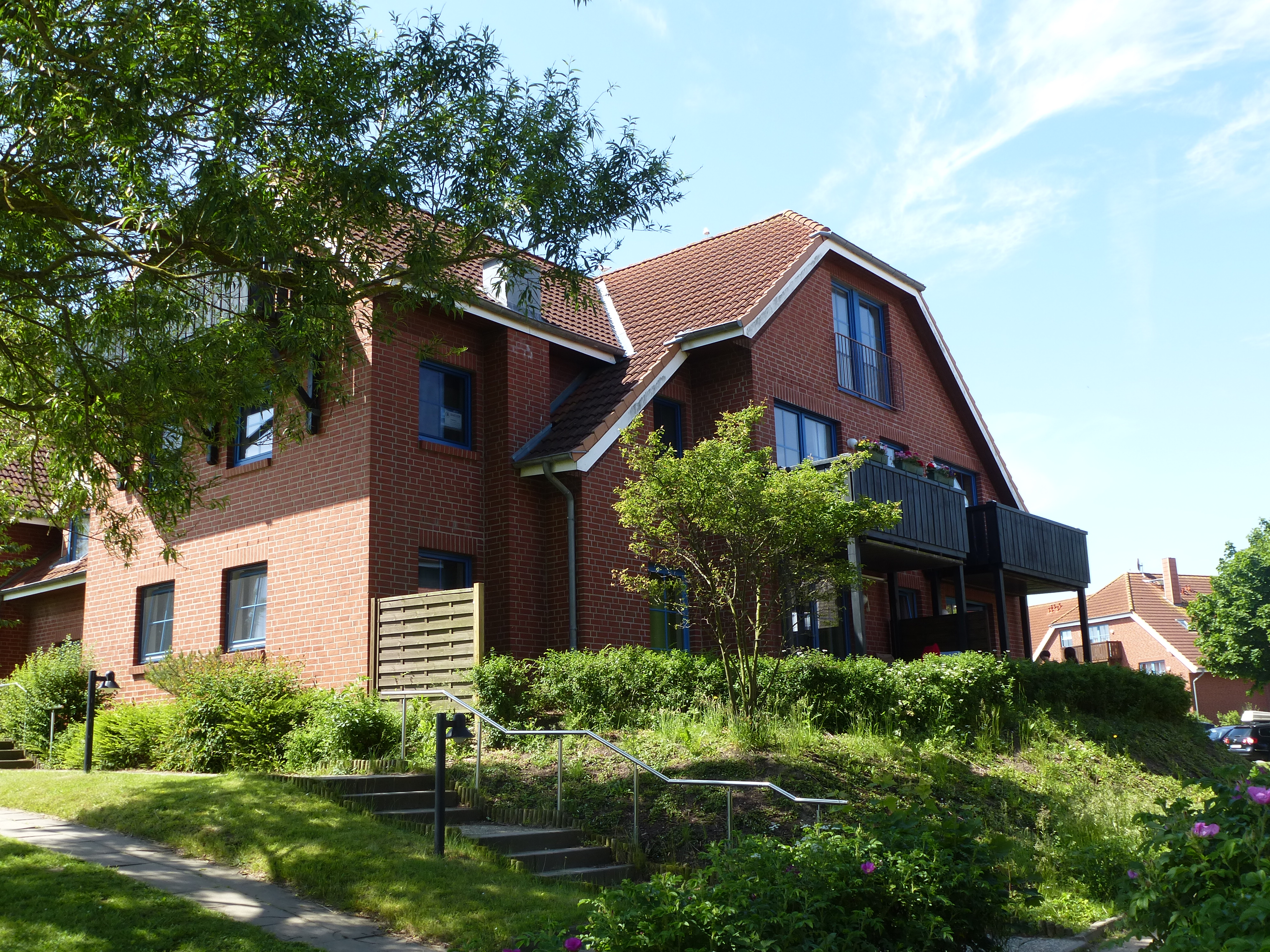 Unsere 3-Zimmer Ferienwohnung befindet sich im ersten Stock und hat ca. 60 qm Wohnfläche, sowie einen großen Balkon. Aus der Wohnung hat man einen Ausblick auf die Spiel- und Liegewiese vor dem Haus und kann im Hintergrund schon die Ostsee erahnen.