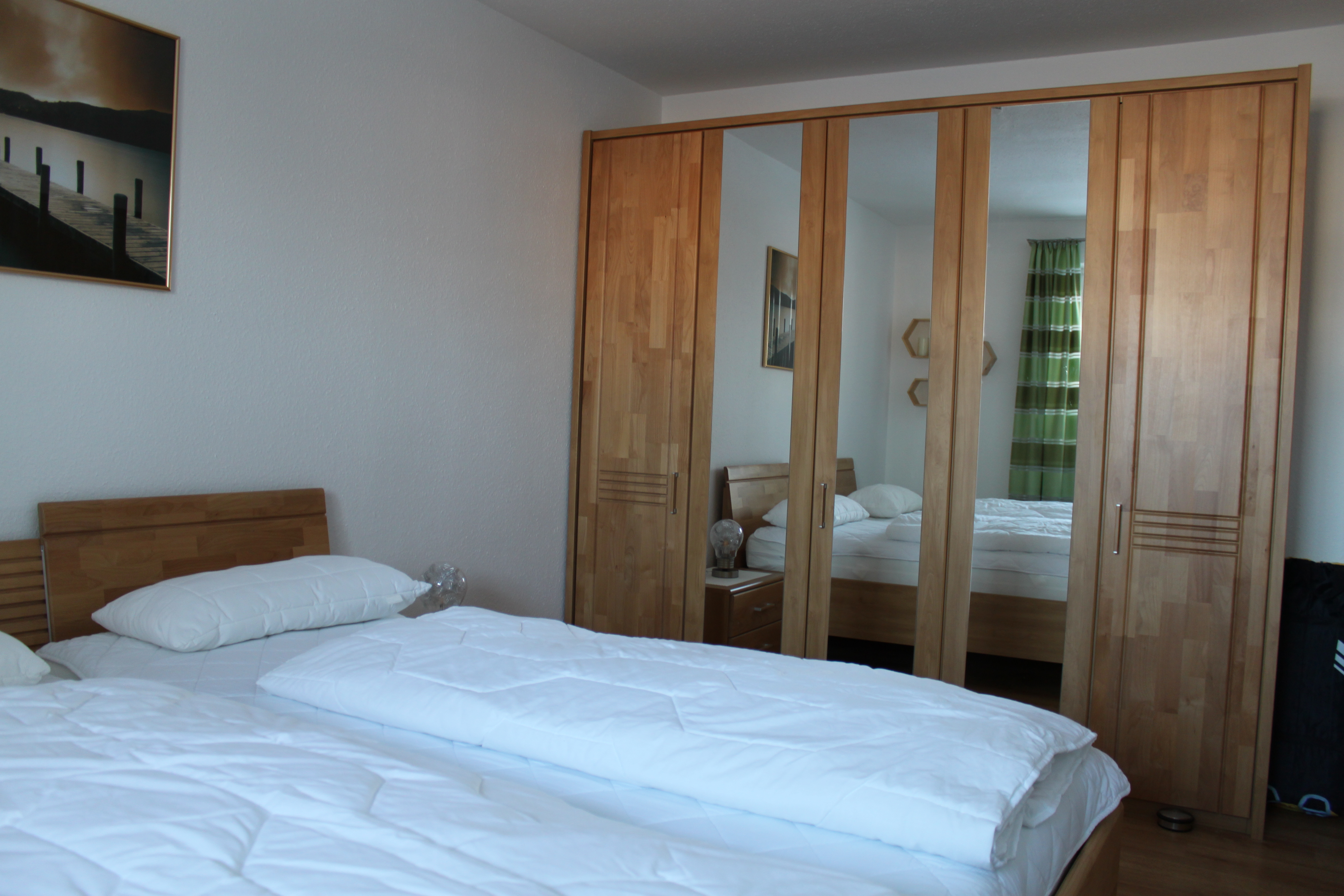 Die Wohnung hat zwei Schlafzimmer: Im ersten Schlafzimmer befindet sich ein großes Doppelbett, ein geräumiger Kleiderschrank, sowie ein Radiowecker. Das zweite Schlafzimmer ist mit zwei Boxspring-Einzelbetten, einem Kleiderschrank und einem Radio-CD-Player ausgestattet. Falls Sie mit Ihren Kindern anreisen, können Sie gerne das vorhandene Kinderbett sowie den Hochstuhl nutzen.