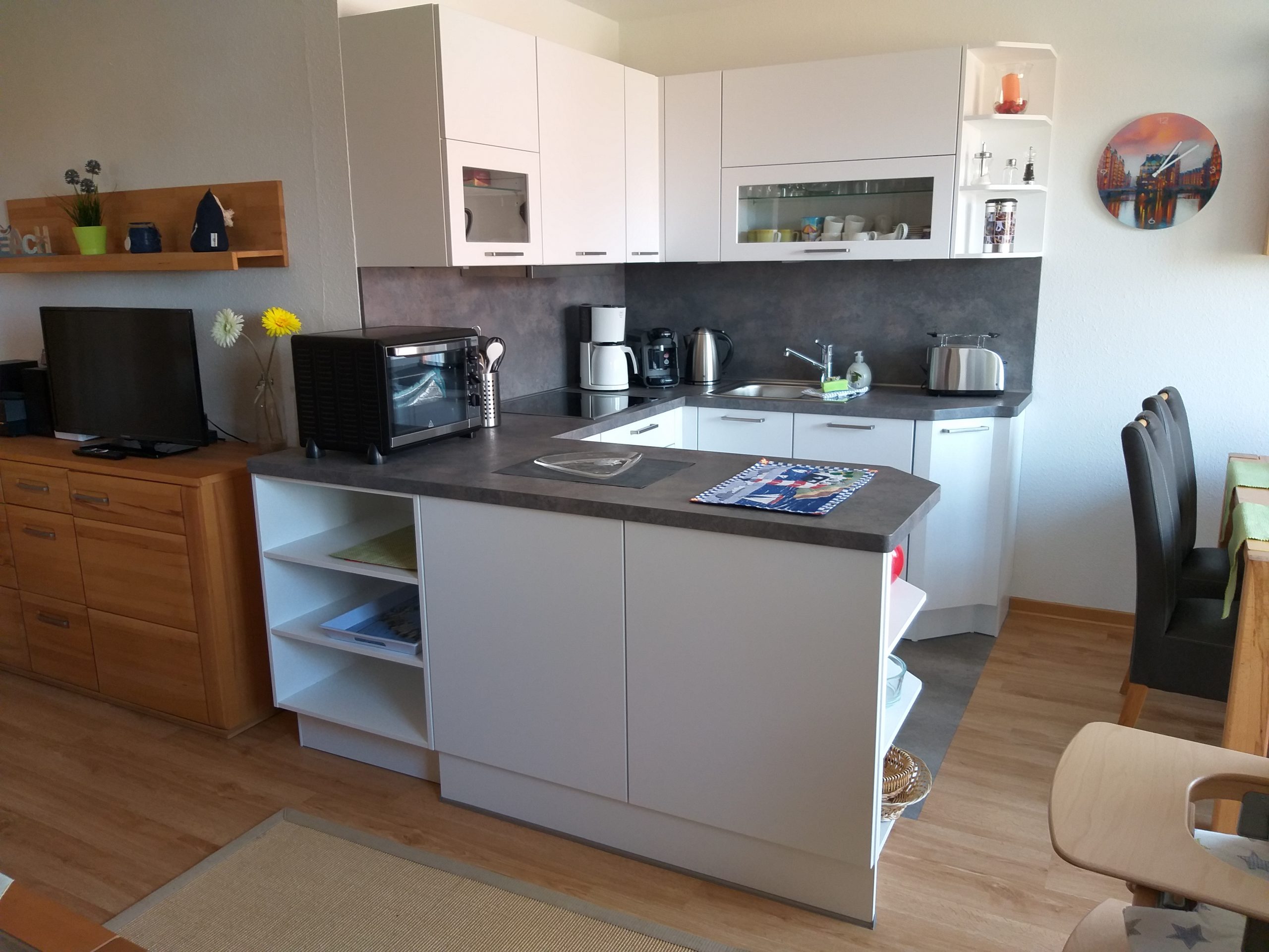 Der Küchenbereich ist in das Wohnzimmer integriert und wird durch einen Tresen, sowie einen Esstisch abgegrenzt. Zu der gut eingerichteten Küche zählen u.a ein Kühlschrank, ein Geschirrspüler, ein 4-Platten-Cerankochfeld und eine Mikrowelle.